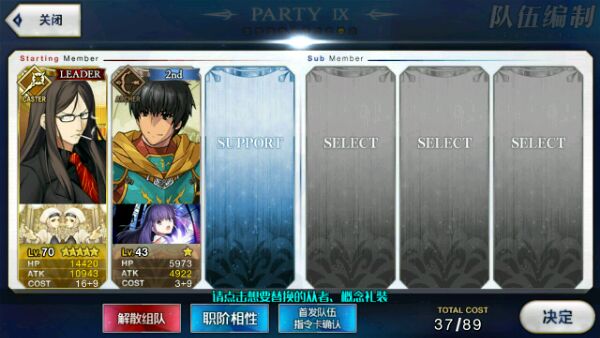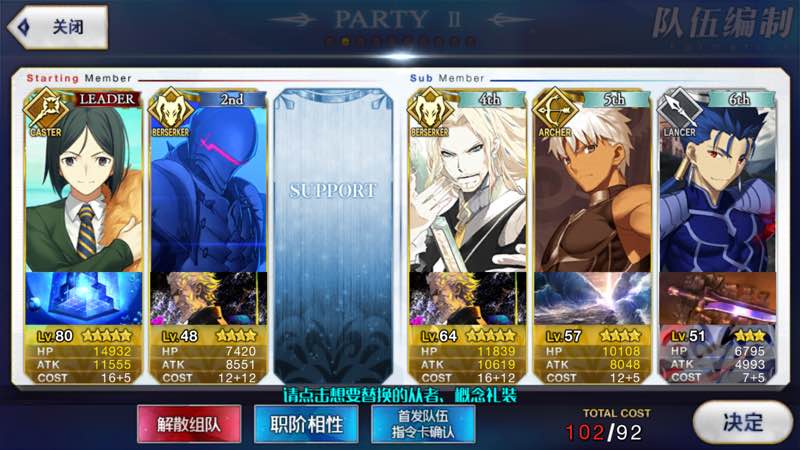 常挂队长90级吾王,90级大公,90级闪闪,90级贞德,宝具1到3级,礼装万华镜40级,技能均为4到5级