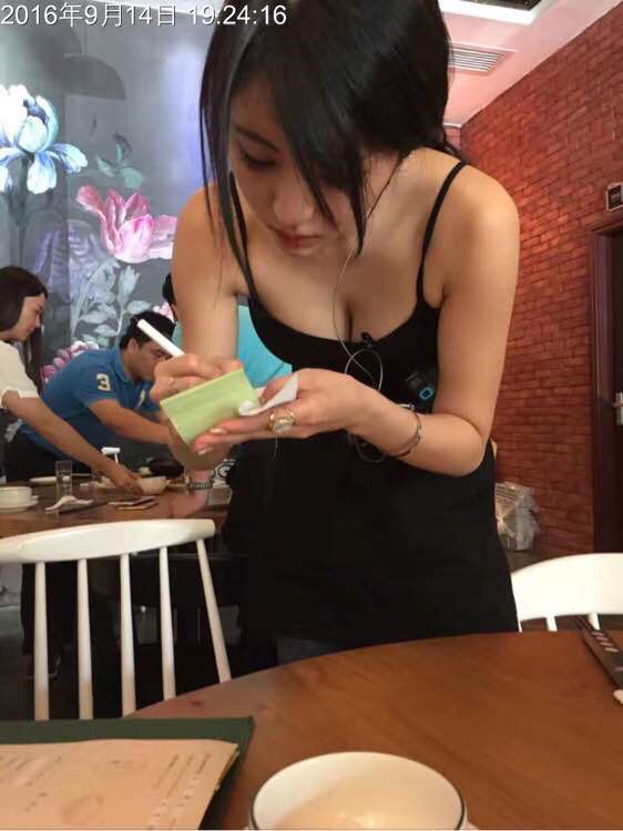 不是,他们家服务员都这样,颜值担当,胸器担当。点菜,买单时这是标准姿势
