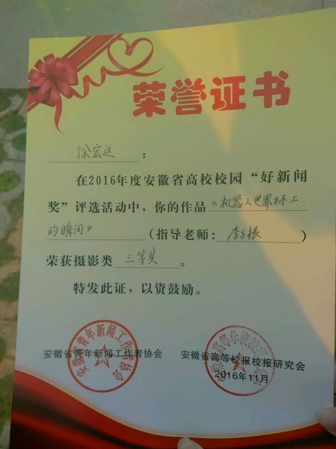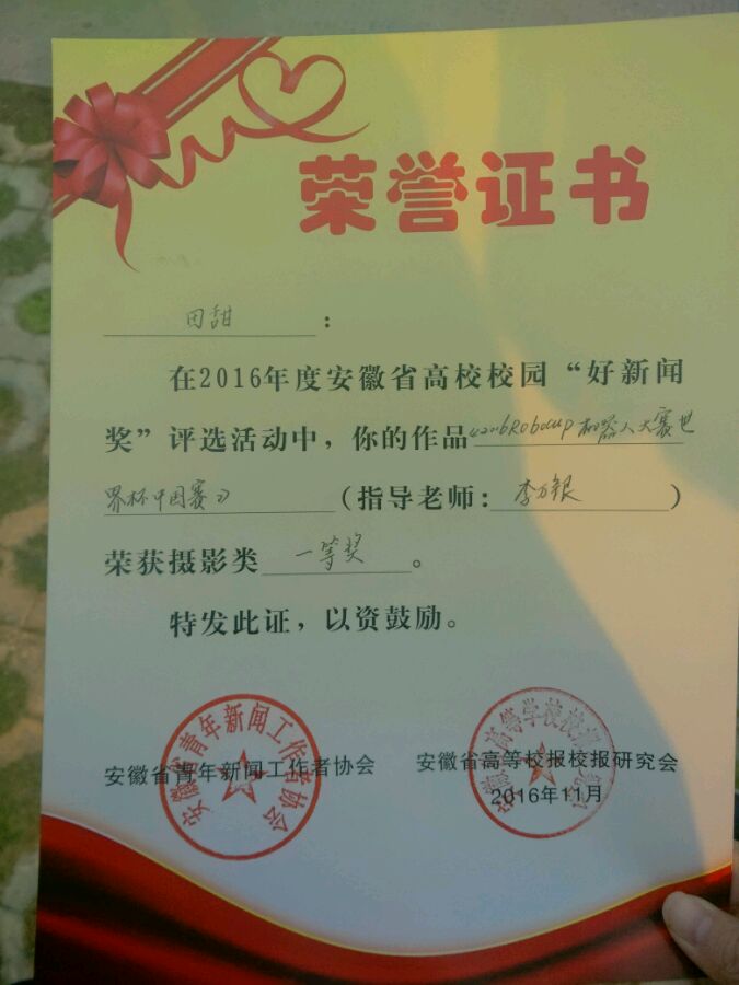 :在刚刚结束的安徽省第十三届大学生记者峰会上传来喜报,由安徽建筑大学记者团报送党委宣传部李万银部长指导的新闻作品以及图片作品获得各类奖项四项。学生记者田甜《2016Rubcup机器人世界杯中国赛》获新闻图片类一等奖,学生记者马戎《人间42秒》获新闻言论类二等奖,学生记者徐宏达《机器人世界杯上的瞬间》获新闻图片类三等奖,学生记者杨文凯《不忘初心,方得始终》获新闻通讯类三等奖。