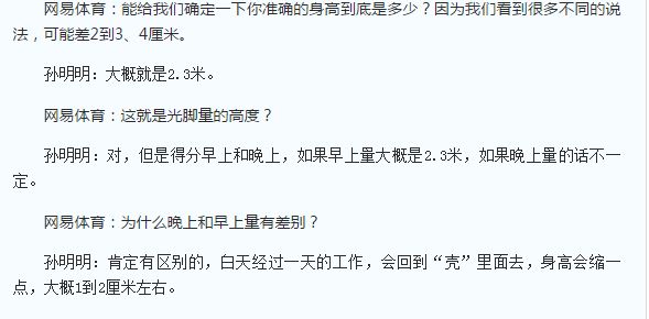 布拉德利却很开心,原来他从来对姚明的“官方身高”不服,说:“他有7尺6(2.29米)?如果他是7尺6,那我就是7尺8(2.34米),他可没有7尺6。”