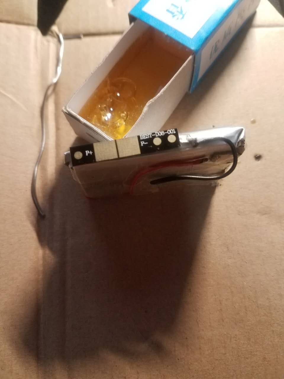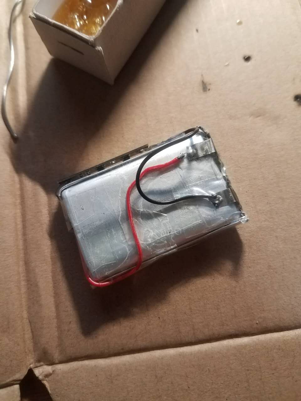 利用透明胶带固定电路板到电池上,注意固定位置要保证能放进电池框,并且正负极能对应电池框的正负极