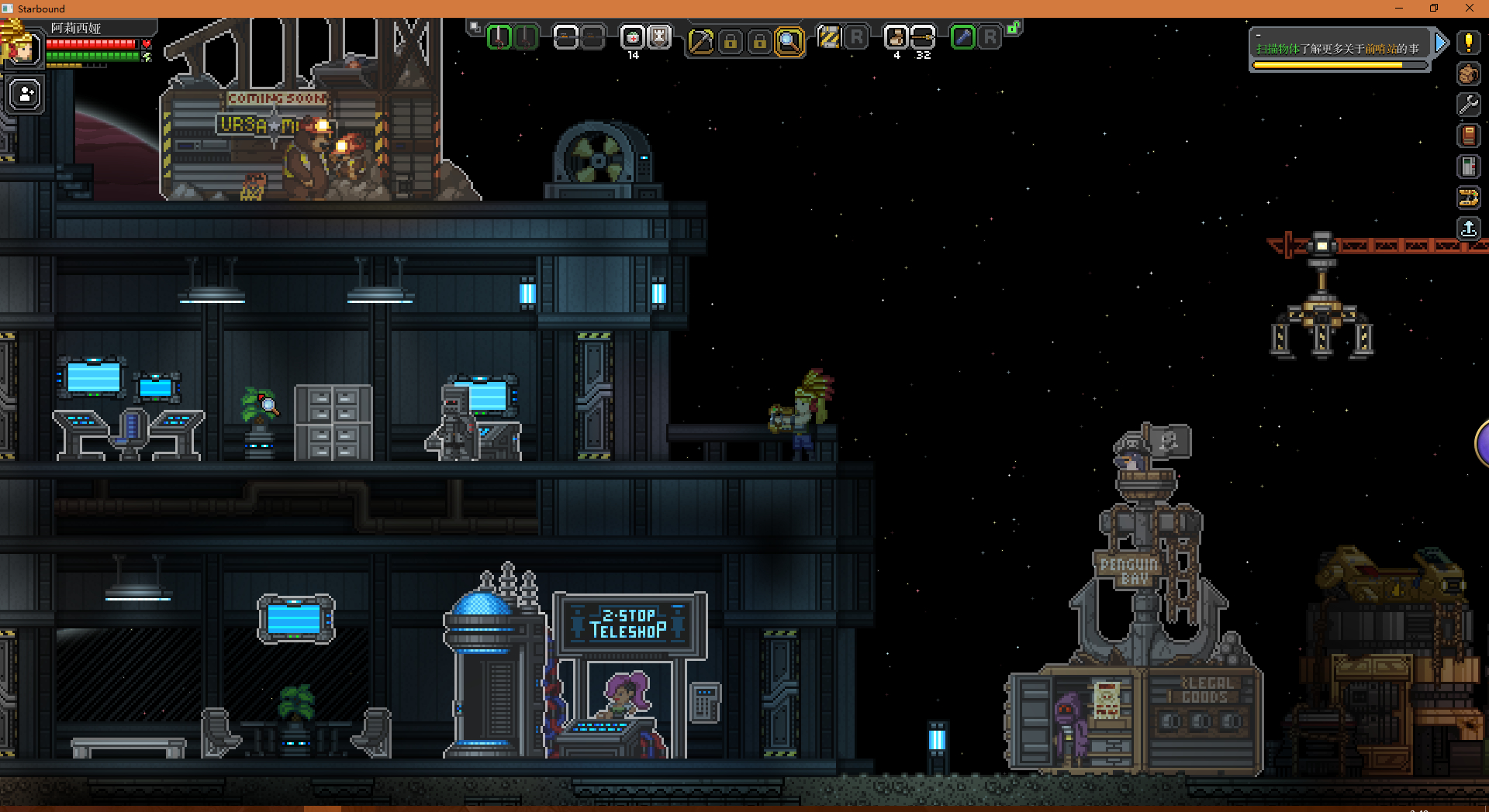 光头吴克,传送商店,泰拉商店,科技控制台,物质转换站,青蛙家具城,最后还有地下的企鹅酒吧,就这7个扫描点