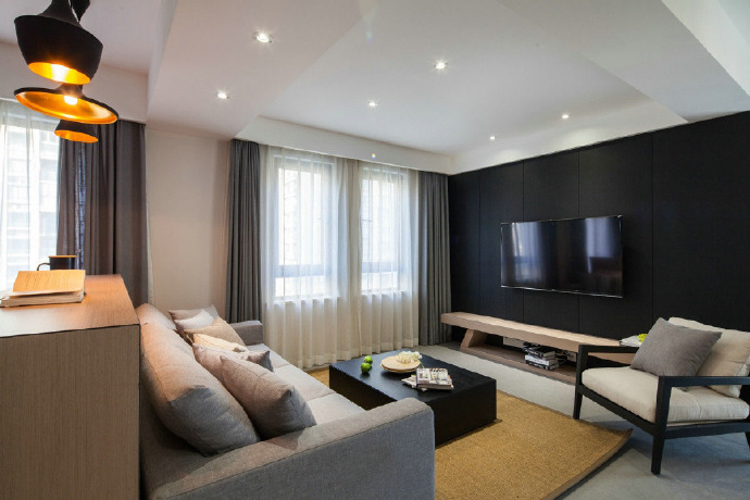 现代简约风三室一厅改成两室一厅,整体以灰、咖色为主调,线条简洁流畅又不失格调。