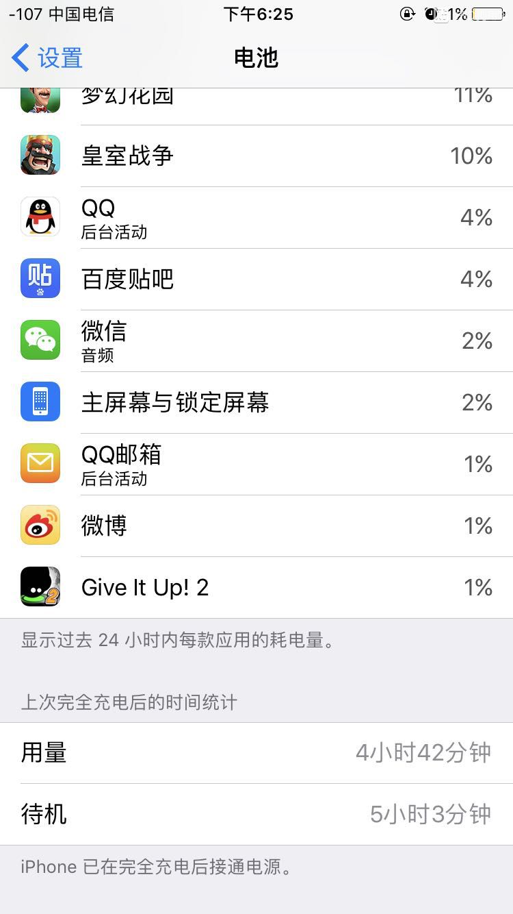 全程4g没关然后待机了也就10十分钟然后全程玩游戏贴吧微博4.42个小时这就是小七的真实续航,看了看我刚充完电就关机的6s,心里一丝丝的满意
