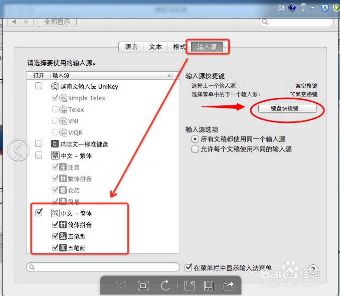 在弹出的界面上,选择输入源。在输入源的勾选框里,勾选好“中文-简体/简体拼音/五笔”。