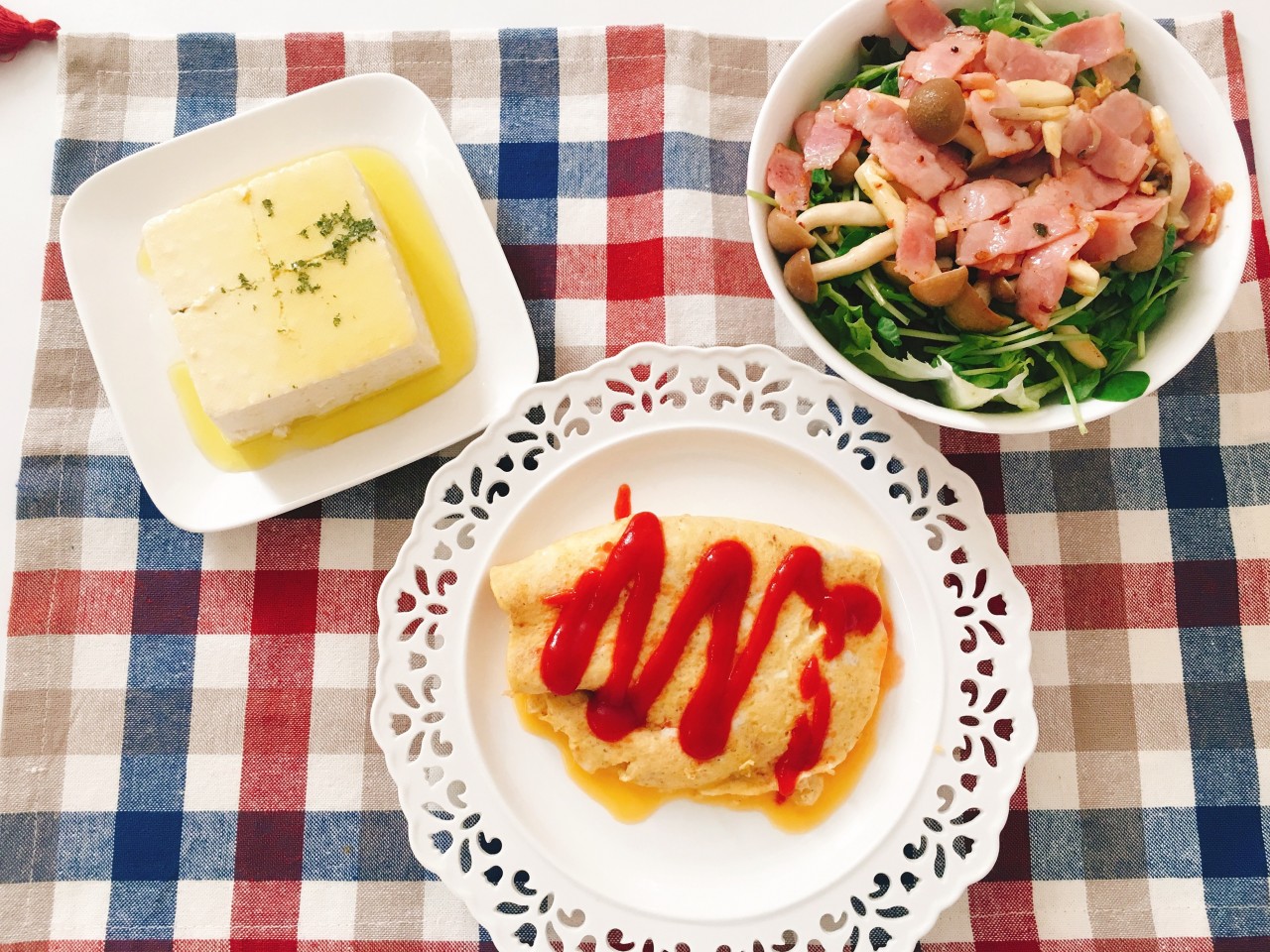 乳酪鸡蛋肉卷,豆腐,蘑菇培根沙拉