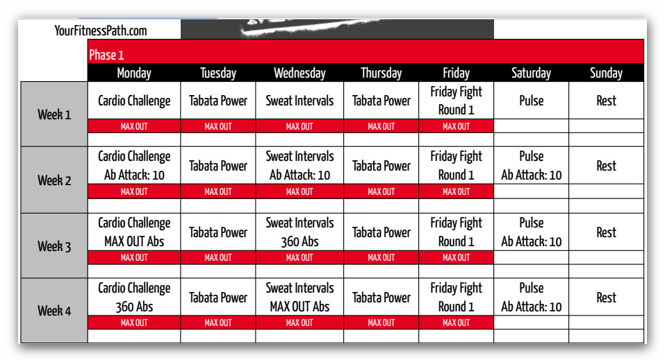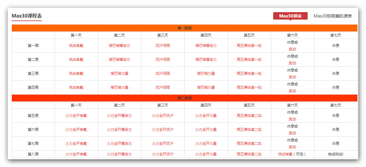 自我挑战模式: max 30里面, 当你累到不行而想自己喘口气的时候, 拿个本子,写下你休息时候的时间,比如你跳到5分35秒就想休息了,写下来(就是课表里头MAX OUT红色的那个框),当下一次你再跳这一个教程的时候,最好挑战自我,让你不得不休息的时间更长,你的目标,就是全程不要自我休息。