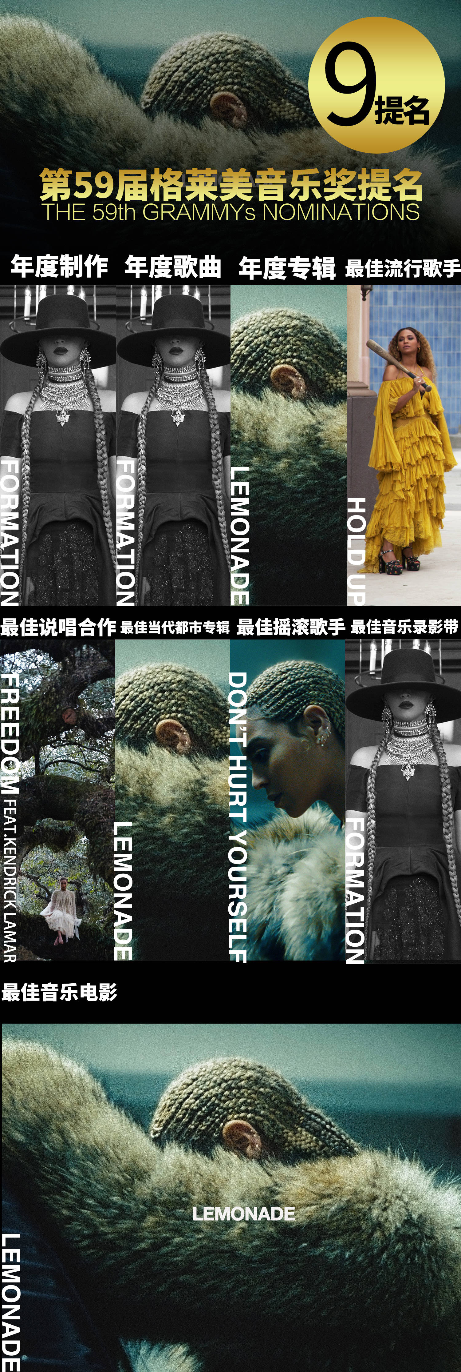 LEMONADE入围大奖年度专辑、最佳音乐电影,Formation入围年度歌曲、年度制作、最佳MV,Hold Up入围最佳Pop Solo表演,Don't Hurt Yourself获最佳摇滚Performance提名,Freedom入围最佳Rap/Sung Performance!