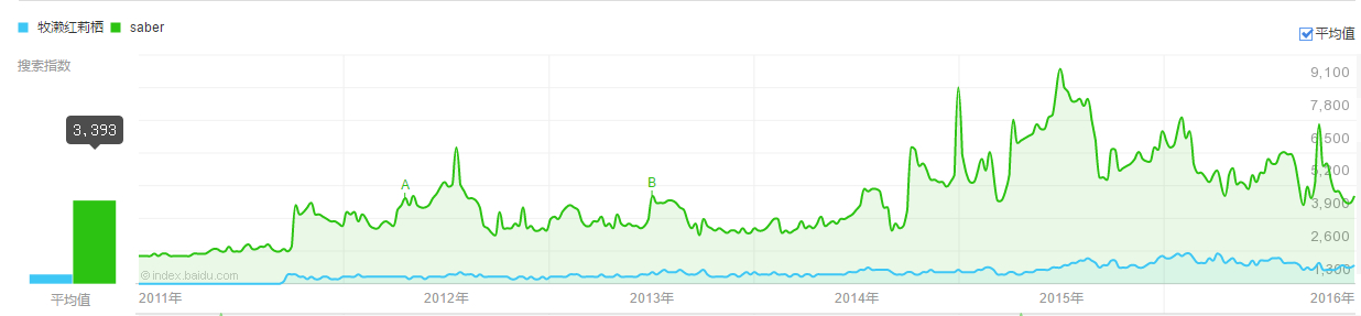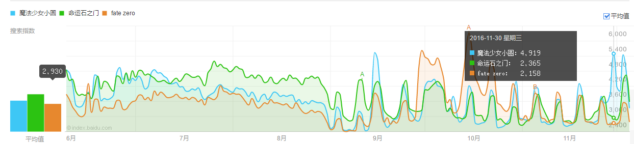 这是《魔法少女小圆》,《命运石之门》,《fate zero》的数据对比图。可以看出,在2011年小圆盒fz把石头门压着打,尤其是fz,搜索指数基本是另外两者的4,5倍。不过到了2016年12月,三者搜索指数基本差不多了。大概可以体现石头门生命力顽强,毕竟另外两者都是当年宅圈无人不知无人不晓的大热番。