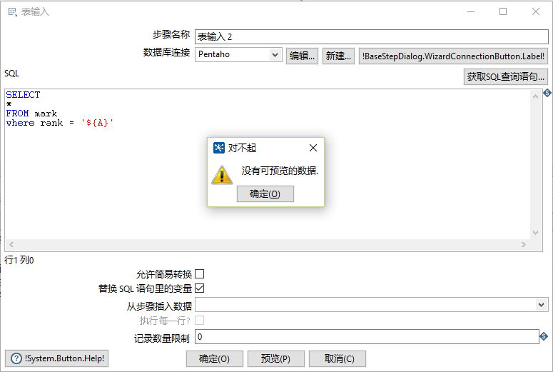 转换如图,目标是在“表输入”中获取字段A(数值为1),通过设置变量在“表输入2”中引用得到mark表rank=1的行的数据,可是试了很久都没有拿到。已确认在设置变量后直接输出变量能拿到A的值且mark表有相应的行数据