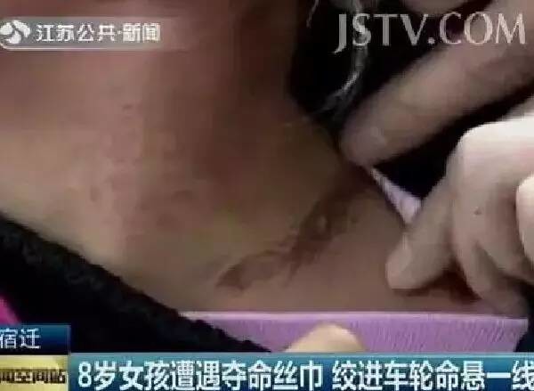 近日,江苏宿迁一位8岁女孩乘妈妈的电动车时,围着的长丝巾两头都被绞进后轮里,脖颈被死死勒在牙盘上,女孩开始脸色发青,舌头伸长...