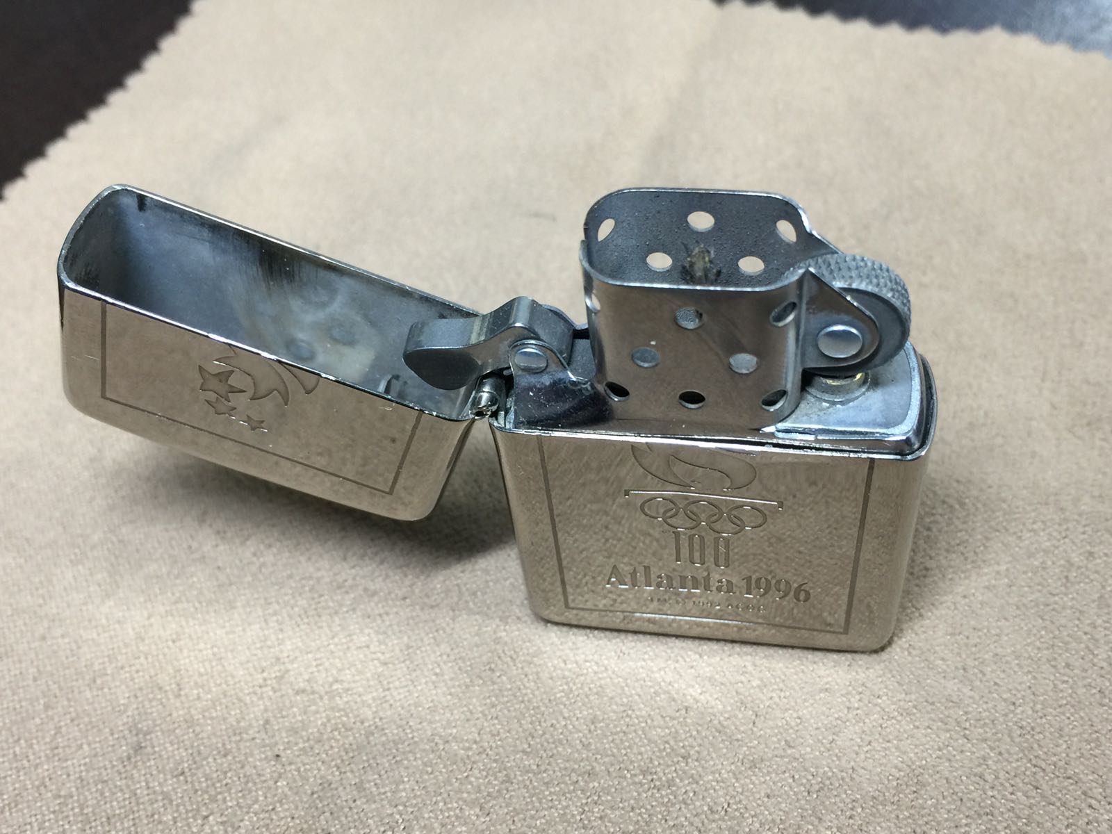 【具体描述】二手1995年9月 SILVER PLATE 美版镀银底刻机 96亚特兰大奥运会,反底刻。机身正常使用擦丝划痕氧化,背面局部磨损痕迹,八角无磕碰,正面硬伤 一处圆弧形凹陷,定义差品。铰链正常,原配96年内胆打火强,内胆相同位置凹陷,无包装。
