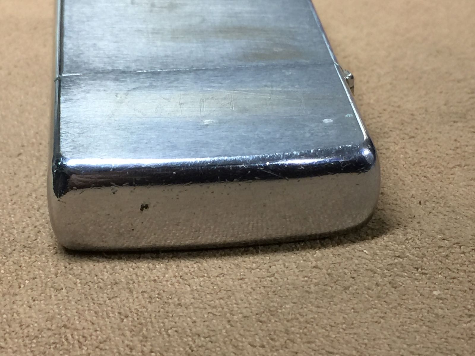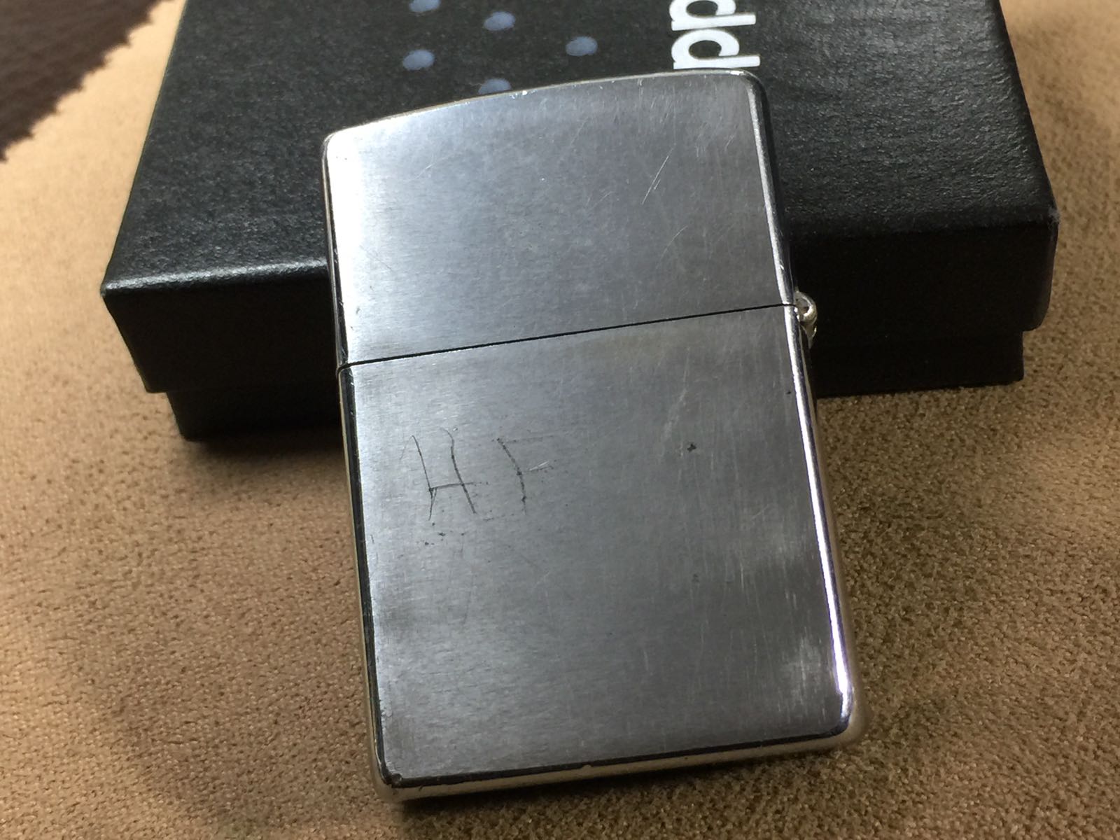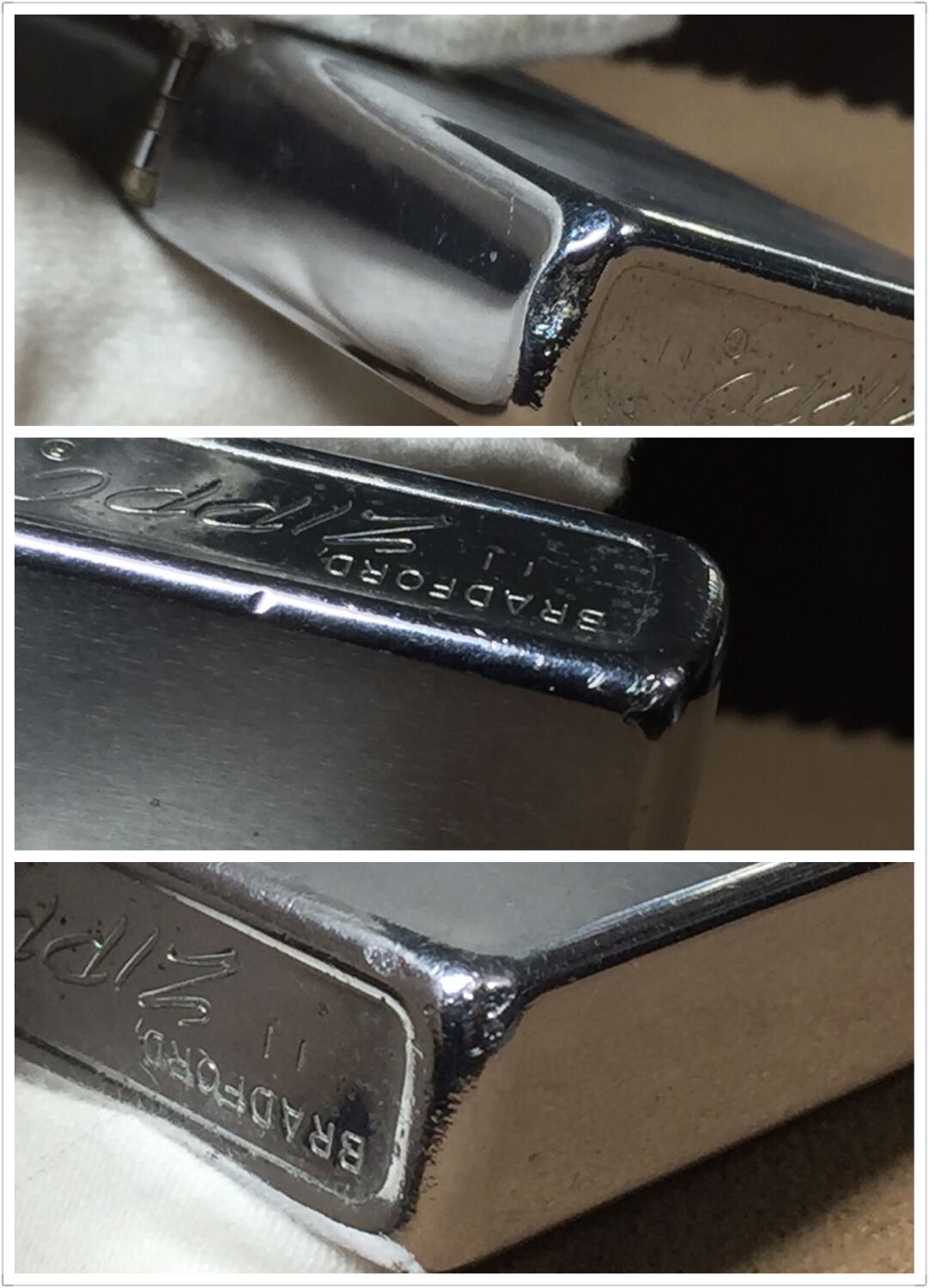 【具体描述】二手1970年拉丝光板 反底刻。机身正常使用擦丝划痕污渍,镀层局部磨损,正反面有浅刻字,边角麻点 磕碰较多,定义差品。铰链正常,原配内胆打火一般 摆锤少许磨损,无包装。