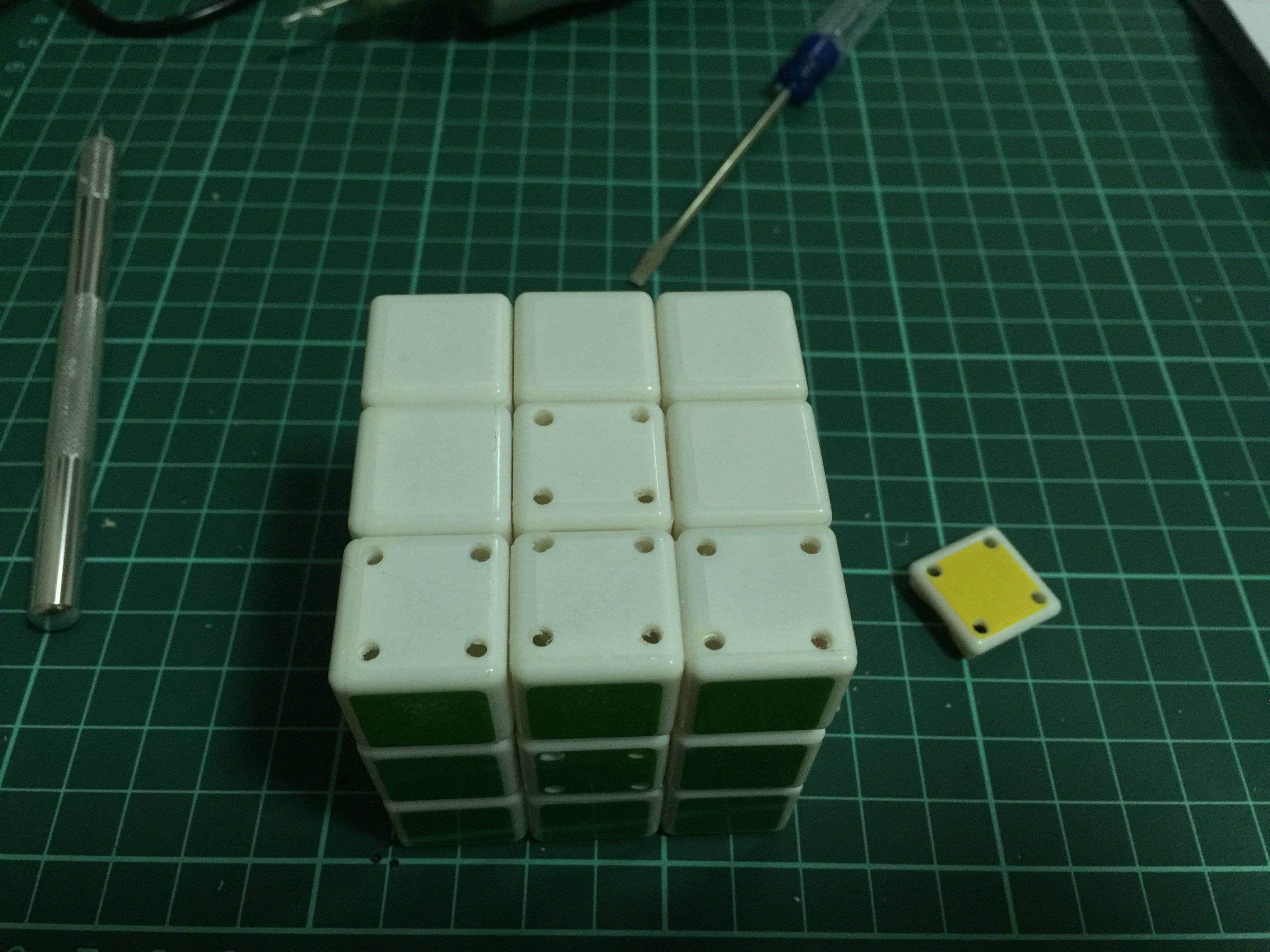 三阶魔方1个,3*1mm磁铁216颗,34*15*0.3mm贴片若干,1mmABS板材若干,万能胶水,透明胶带,贴纸若干,粗细砂纸若干。