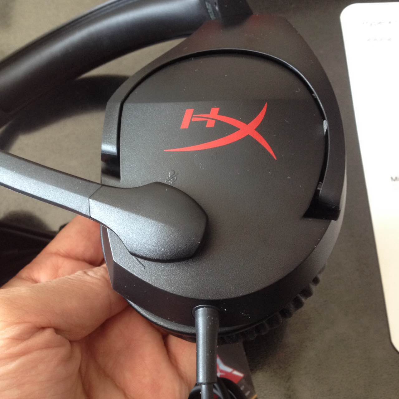 接下来是耳机的本体了,外观红黑配色不是原创但是也略显经典,金属头梁,大耳罩,整个耳机为塑料材质表面略带磨砂质感,耳包上红色HYPERX缩写非常抢眼,MIC部分阻尼适中而且可以随意的弯曲,但不能拆卸。
