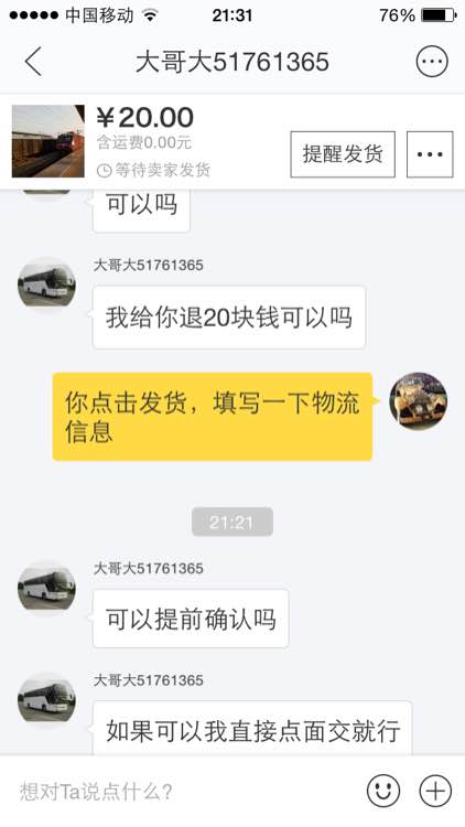 至今为止一直推脱,几百块的东西,20块的邮费链接。最后竟然发的面交,还让尽快确认收货