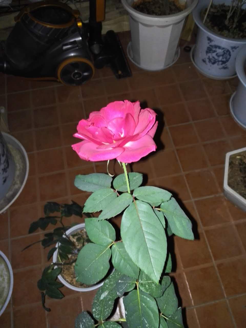 基本为纯红色,所以手机也没法拍出层次感,真花比照片好看一点。看起来不像什么好品种,花瓣较少,不过味道不错,只开了一朵2米外也能闻到花香,花径大约9厘米。从牙签扦插,辛苦种到开花,实在不容易,尽管看起来不像常见的好品种,但还是想知道叫什么名字,所以请大家看看。