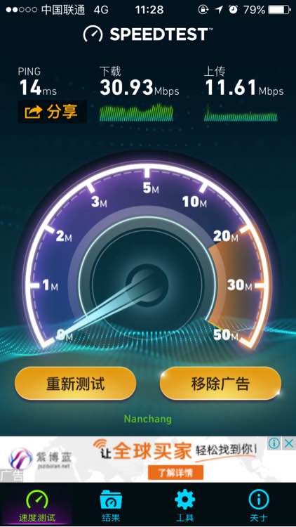 发现更新手机营业厅送1G流量,可是仅限今天用完,于是测速。在大楼里,所以信号只有2格,-107
