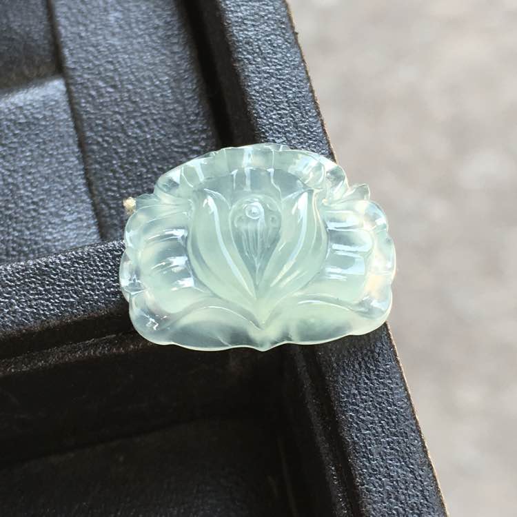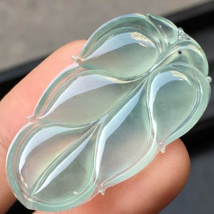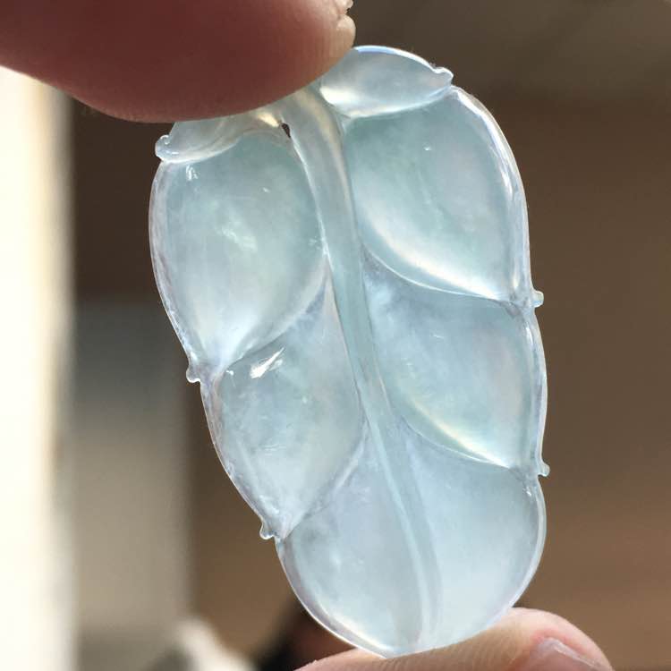 0💰818,冰种玉叶吊坠:35.5-20.7-4.4mm,完整无裂,曲线优美,水足通透,底子细腻