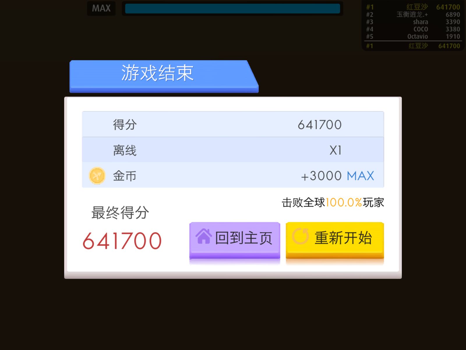 刷分挺容易的,就是需要时间,本人刚玩没几局就刷到60多万分,后来实在不想刷了,因为直接关掉游戏没记录了,还好截了张图。