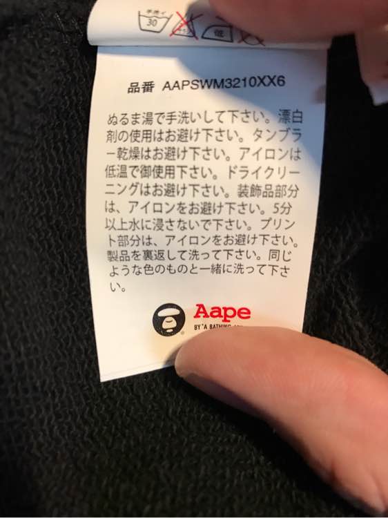 aape的衣服 可以看衣服内胆洗标的格式正不正确还有洗标的字体有没有错误 正品洗标的背面在洗涤说明下方仔细看有淡淡的水印 这一点可以过滤掉绝大多数的低仿,这样看没拍全,私我发图吧