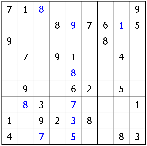 下面是一道标准数独题的一个盘势。前面均利用简单的技巧(行、列、宫、区块排除和数组等)完成,直到这一盘势下。