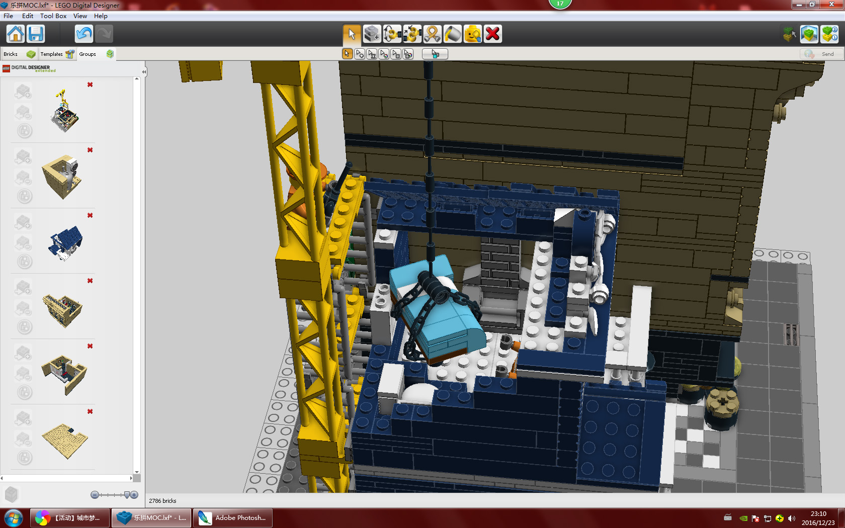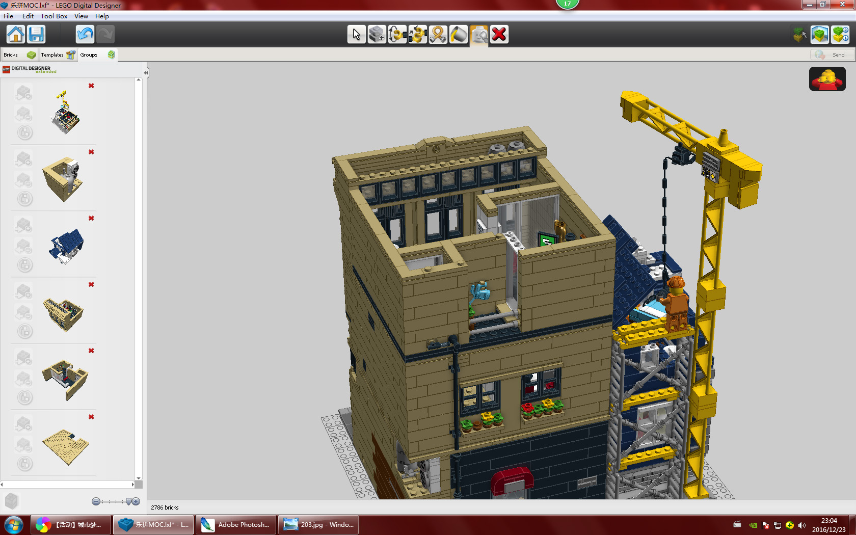 旁边是在建小房子,后面有脚手架和吊机,吊机太小不能乘坐只能是遥控了,小人手上有遥控。