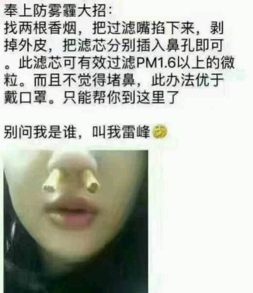 防雾霾神器。过滤效果绝对优于口罩!能过滤PM2.5~1.6!并且简单,便宜,物美价廉! 以后可能会常用到。[呲牙][呲牙][呲牙] 声明:本人不是卖烟的,全当学雷锋。[得意][得意][得意]