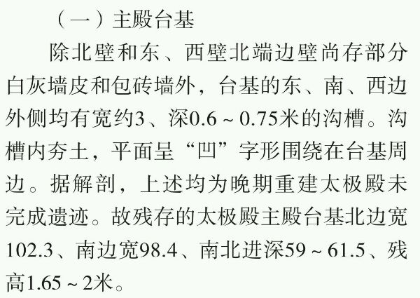 太极殿正殿夯土殿基平面为东西长方形。其东西宽102.3米,南北进深约60米。面积达6138平方米。