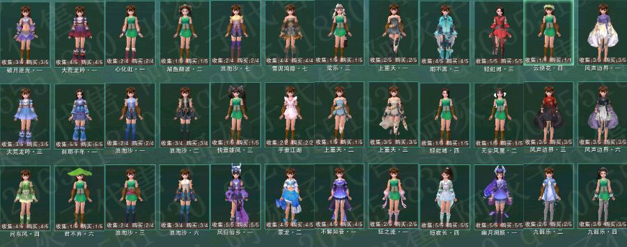 【外观】:29套成衣包括14限量【粉繁 紫白菜 谷雨 白螺母 蓝花开 红彩云 粉公主 蓝不期 黄娃娃 蓝无色 绿兰庭 白九壤 七夕衣服 中秋粉衣服】;7页拓印+6武器