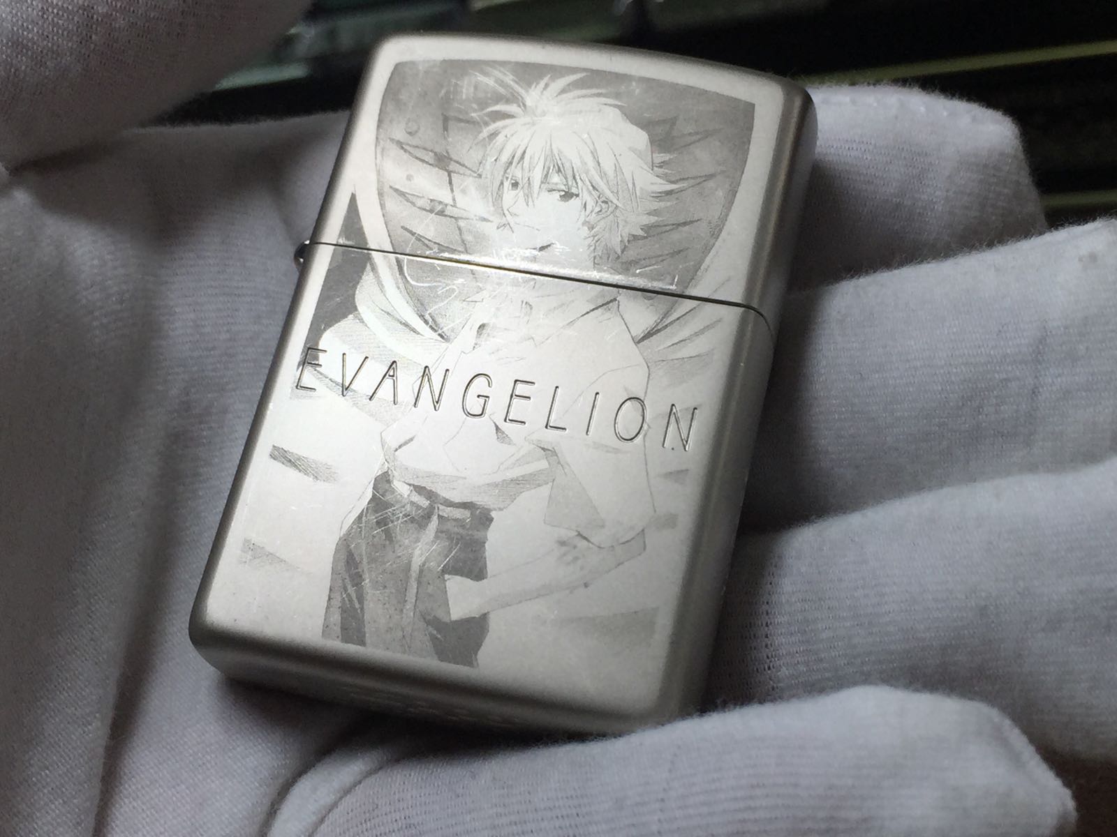 【具体描述】二手2011年2月 限量EVA 渚薰。机身磨砂底板 正面蚀刻+镭射图案,侧面限量号蚀刻,本机编号7309。整机轻微使用擦痕,无磕碰,铰链正常。原配同年同月内胆使用次数不多,打火强劲,黑纸盒包装。