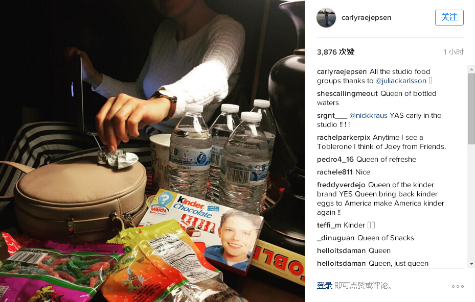 12月7日,Carly发布了一张在录音室晒零食的照片并@了音乐创作人Julia Karlsson。