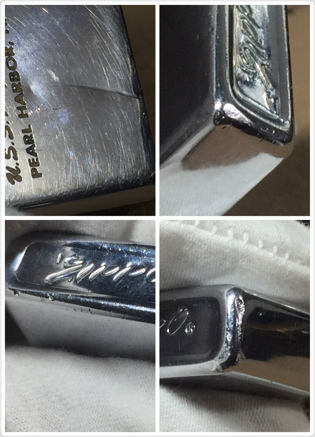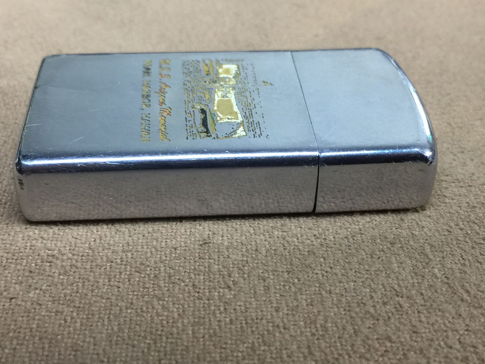 【具体描述】二手1973年 镜面蚀刻工艺窄机 珍珠港事件 亚利桑那战舰纪念馆。机身正常使用擦丝划痕,正面有道凹痕,边角较多针眼和磕碰。铰链略松,定义差品。原配内胆打火中等,摆锤少许磨损,无包装。