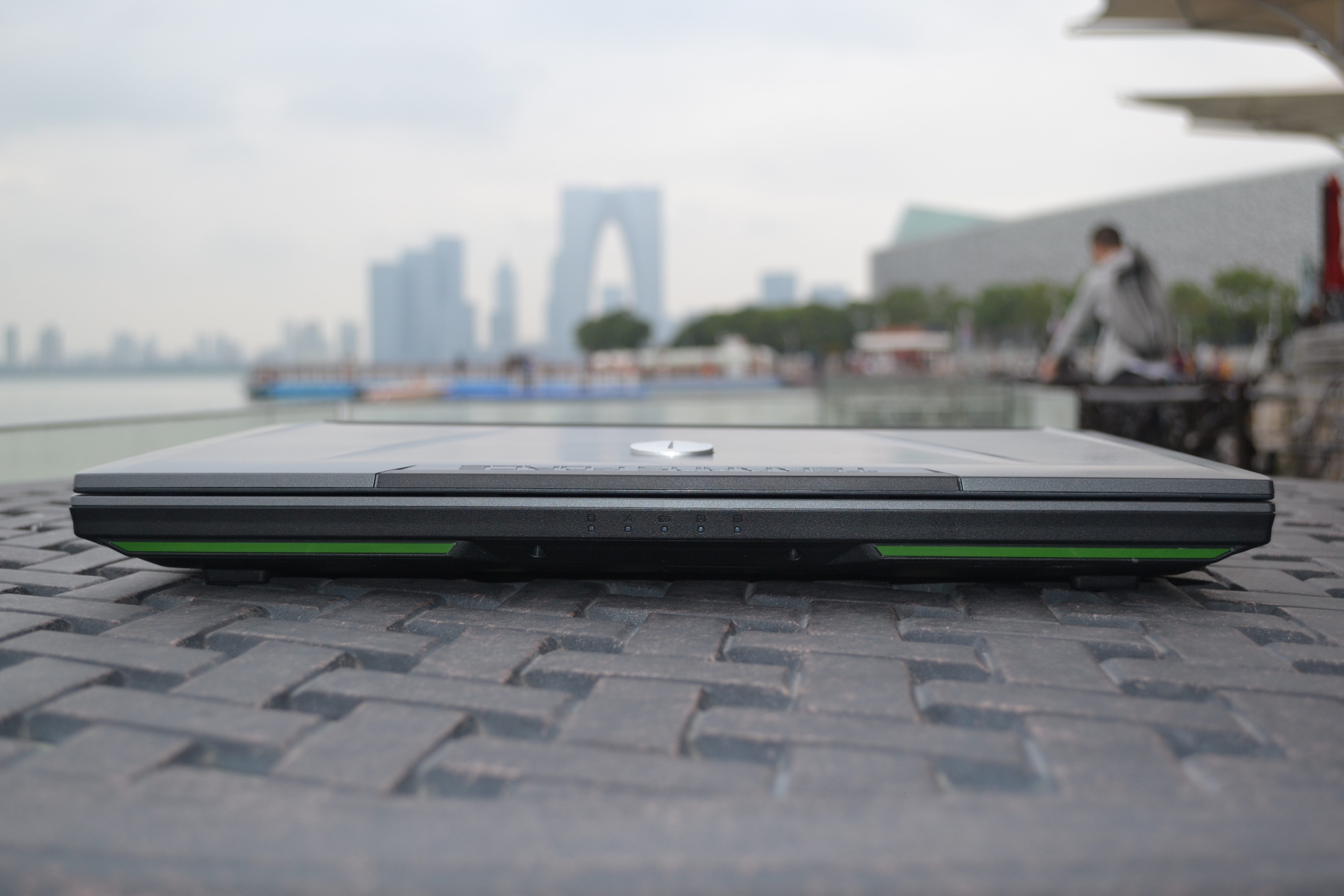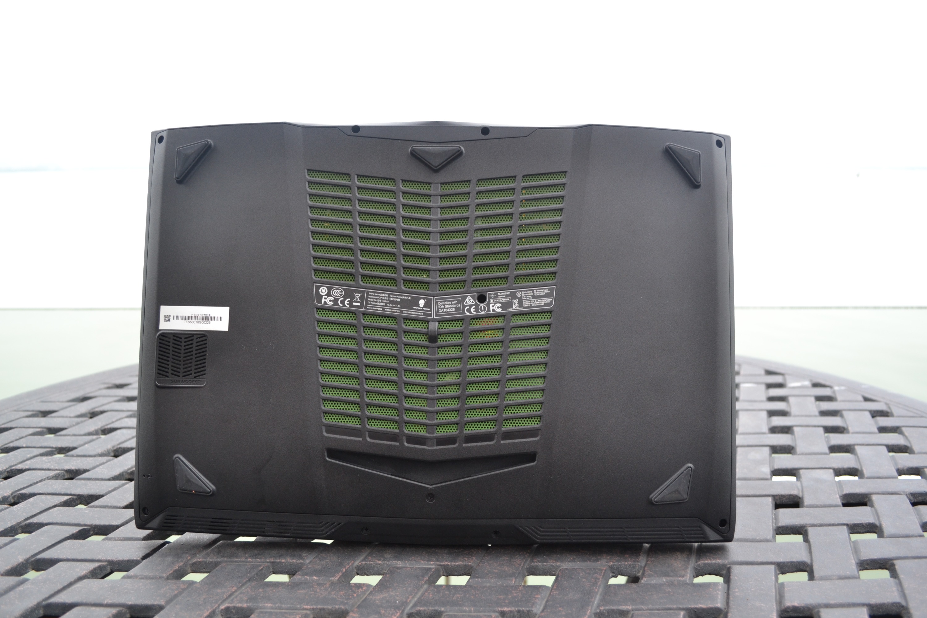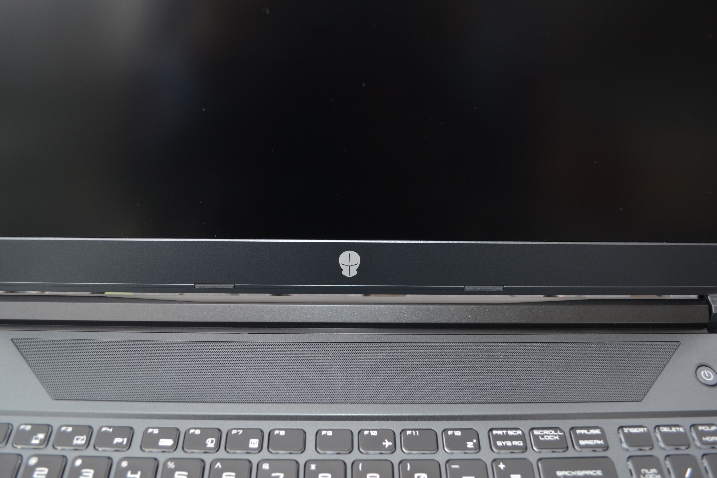 未来人类S5的顶盖部分采用了金属材质打造,摸上去手感相当不错,而且几乎不会出现指纹的问题。顶盖部分并也非只是一个单纯的平面,在上面有凸起的四条两对儿对称的腰线,并且中心位置未来人类一贯神秘气息的大铁头赫然在目,再加上点缀的条纹设计,让整机看起来有棱有角,立体感十足!想必这就是电竞本用户所需要的霸气即视感吧!