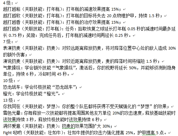 闪闪发光:学会额外技能“闪闪发光”,在附近放置一个播放器,播放器周围的所有友军提高10%的技能强度,持续15秒,冷却时间60秒;