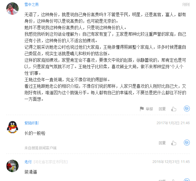 这样的家庭拍裸戏,家里肯定不一样,要像文中说的赵薇,徐静蕾说的,那肯定也是可以,只是家庭气氛就不对了。王艳性子比较柔,喜欢顾全大局,做不来那种坚持”个人个性“的事。