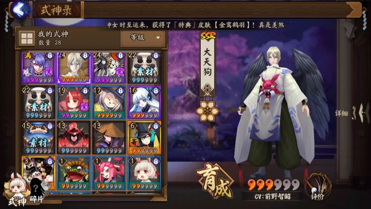 纯属人品爆发,抽到了大天狗+妖刀+阎魔,另外号上还有鸟+夜叉,辅助有兔子,没别的了…