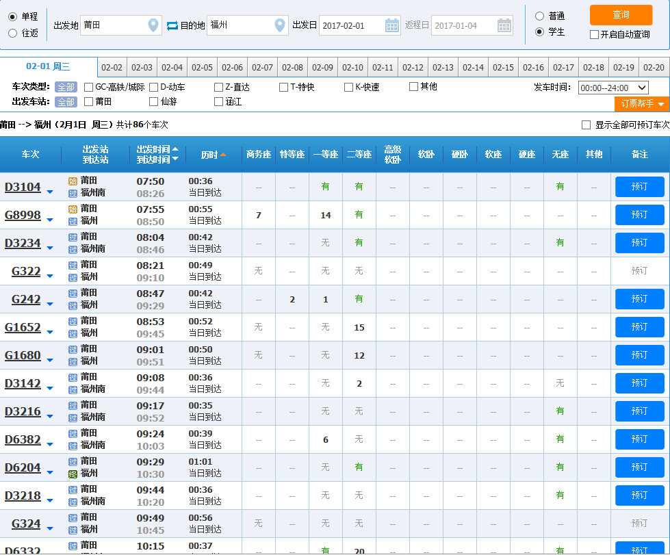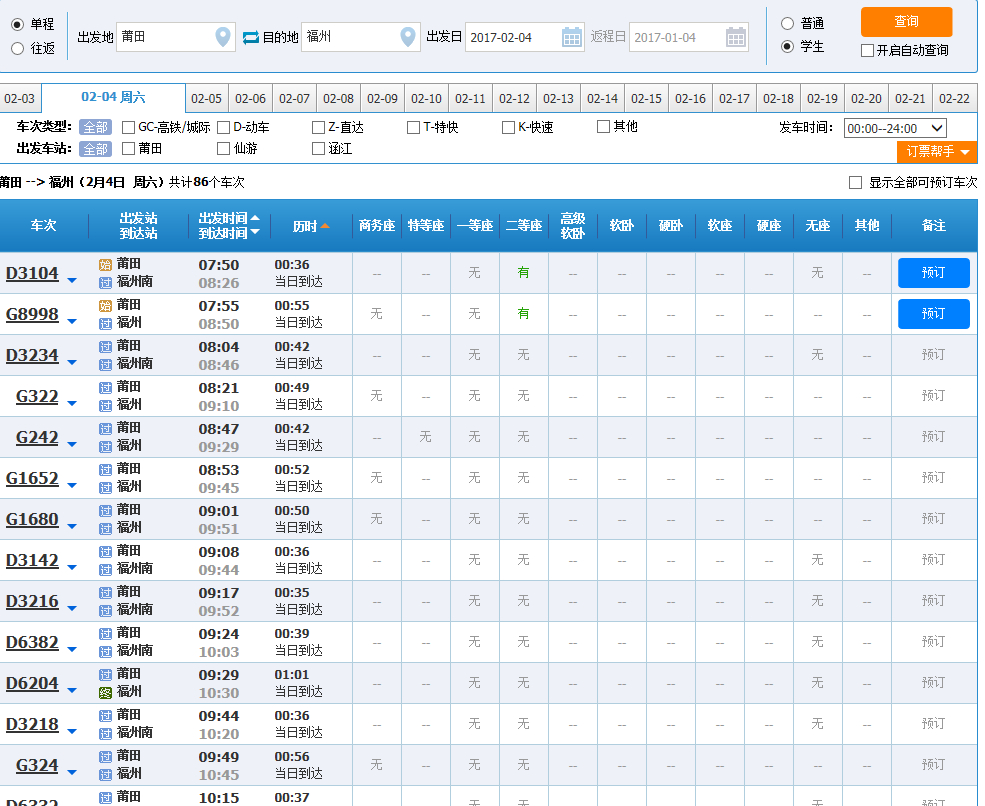 如图,2月3号开始知道2月26号学生票全部都是只有早上两班车有票,其他都没票,我就不信了这么多人买学生票