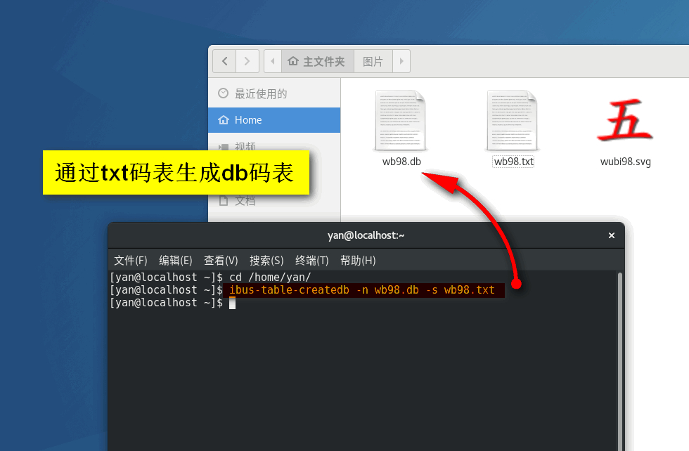 制作好了txt码表之后,就可以生成二进制的db格式码表了。在这里,我将之命名为98wb.txt,放在了/home/yan/下待用。