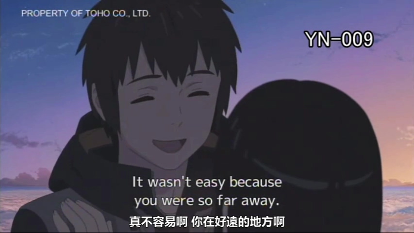 言叶之庭:隐约雷鸣 阴霾天空 但盼风雨来 能留你在此 隐约雷鸣 阴霾天空 即使天无雨 我亦留此地 。