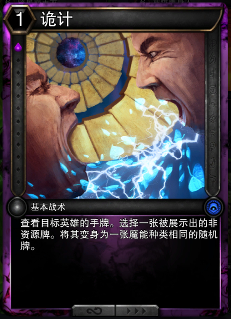 查看目标英雄的手牌。选择一张被展示出的非资源牌。将其变身为一张魔能种类相同的随机牌。