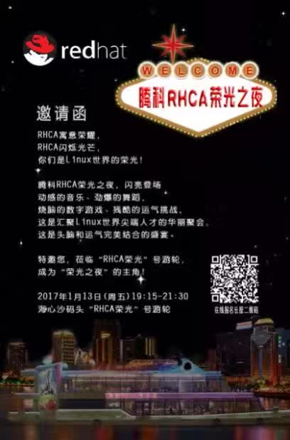 RHCA寓意荣耀,RHCA闪烁光芒,你们都是网络世界的荣光!腾科RHCA荣光之夜,闪亮登场!这里有动感的音乐,有劲爆的舞蹈,有烧脑的数字游戏,还有残酷的运气挑战!这是汇聚Linux世界尖端人才的华丽聚会,这 还是头脑和运气完美结合的盛宴。这里有RHCA大咖与您一起交流RHCA最新技术,把控技术潮流!