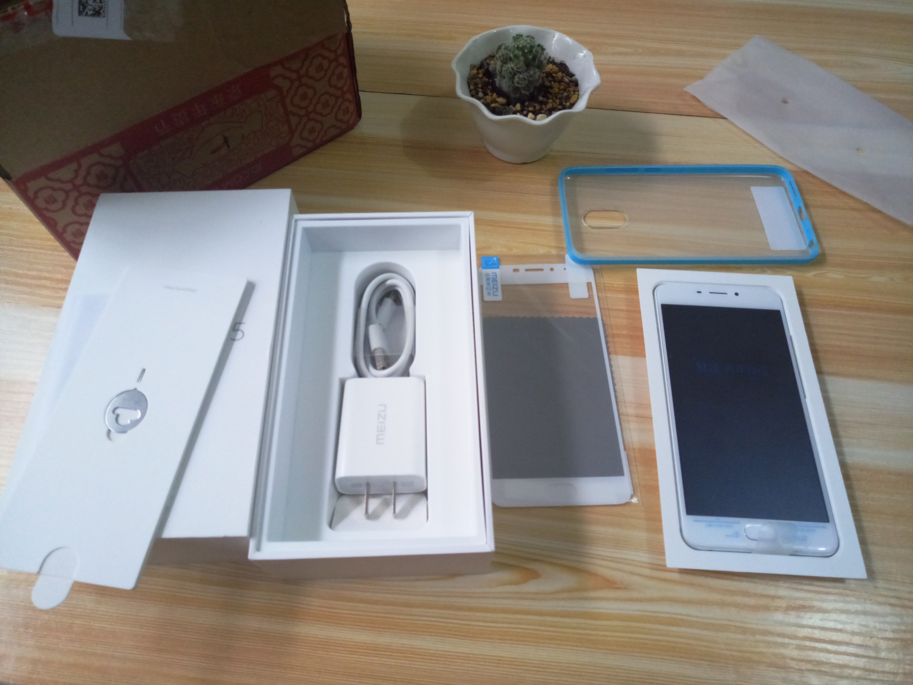 拆开京东包装后就是魅蓝note5的包装盒了,因为买的是礼盒版,所以除了手机说明书数据线充电器外还送了一个全覆盖膜和一个手机软壳
