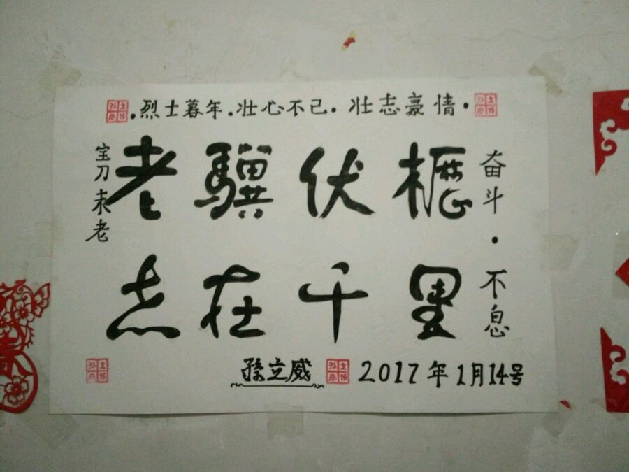 我模仿我爱我家里,老傅办公桌旁边墙上的那副,老骥伏枥 志在千里 毛笔字,怀念文兴宇老爷爷