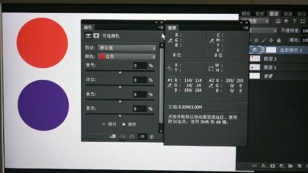 比如以上说的如何让任意的一个颜色换成任意的另一个颜色,比如红色换成这个紫色,就是添加可选颜色调整层然后把信息板提出来便于查看,用颜色取样器工具标记当前图像色,然后就可以在可选颜色调解板上加减RGB值了调板上的青品黄滑条也就是相当于红绿蓝,即左滑加红绿蓝,右滑减红绿蓝,把信息板上的RGB值都加减到这个紫色的RGB值就可以了比如这个紫色是RGB114-14-154那就加调成这样就可以了