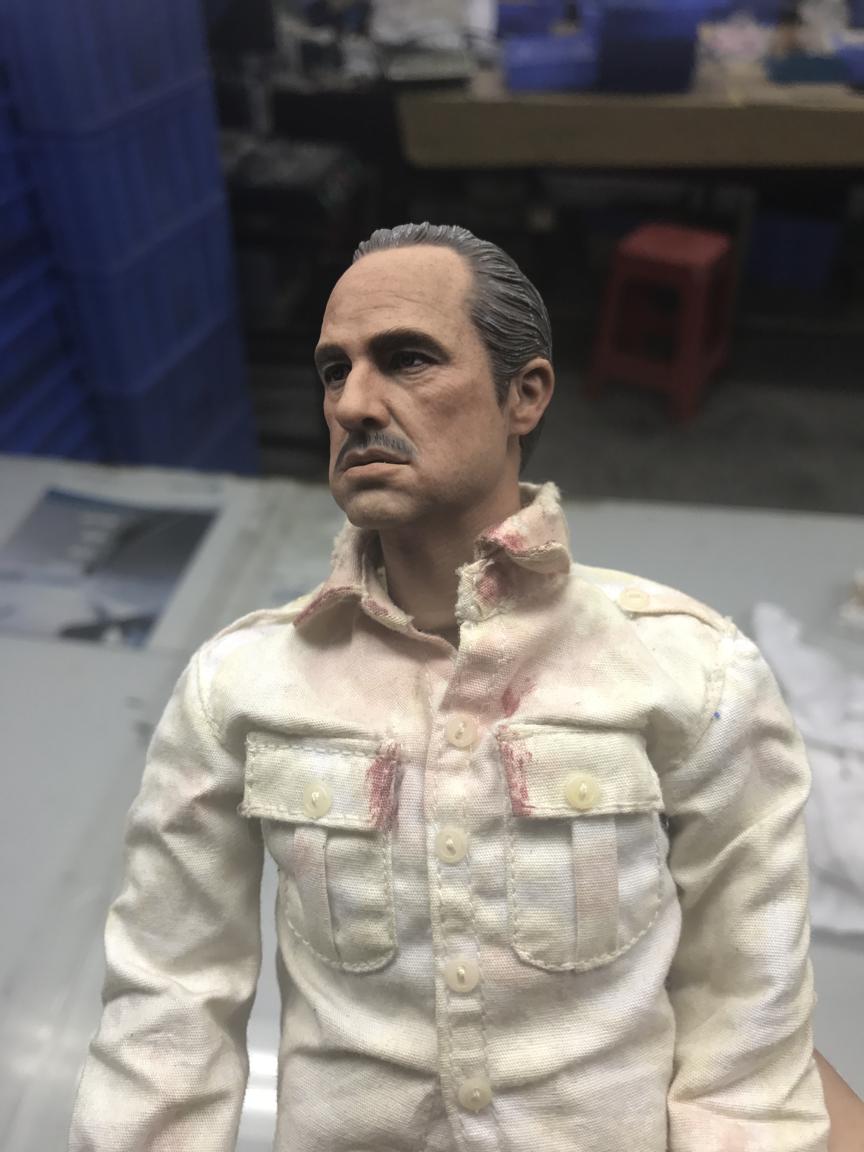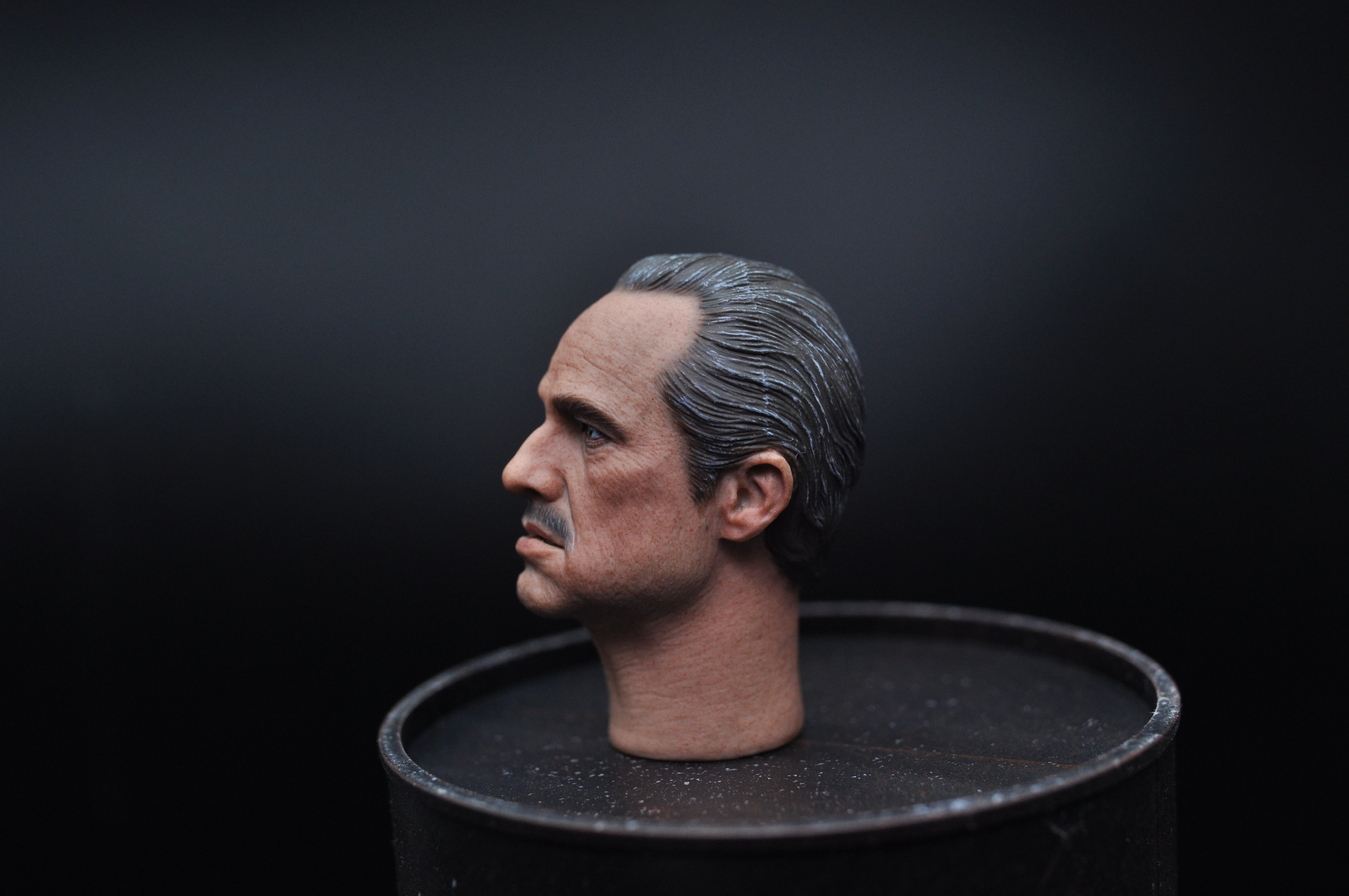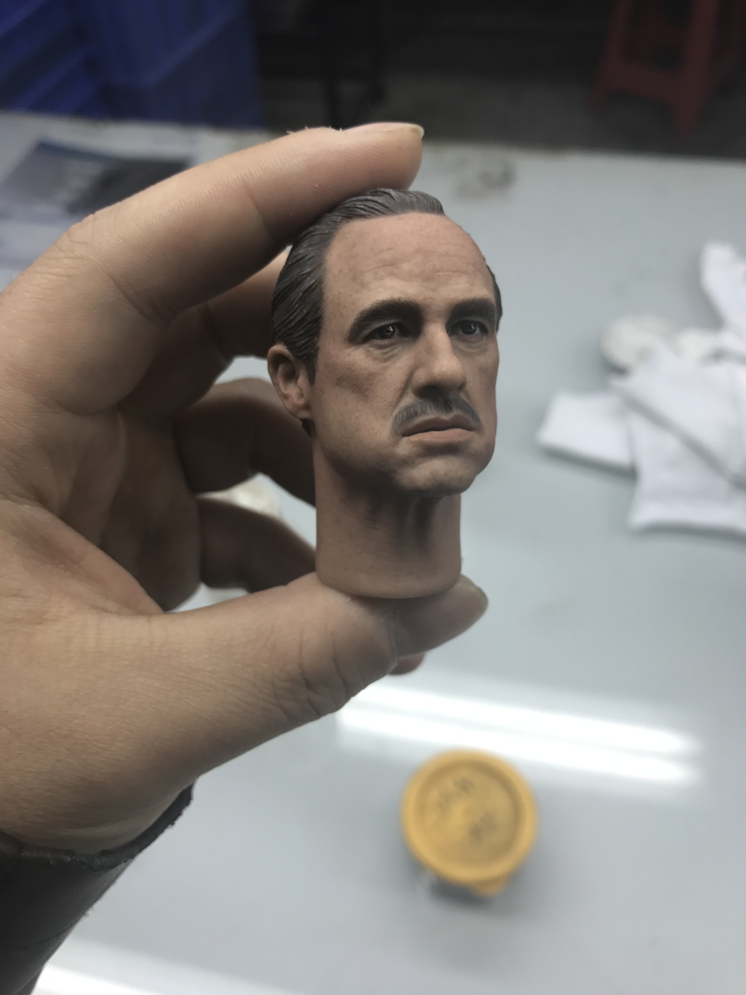 所有真人的脸都不是完全正的,尤其有表情的时候。比较明显就是哈里森福特(印第安纳琼斯),彼得·库欣(星球大战新希望)这类人物。我制作的时候特意保留一点这样的痕迹,这次教父的头我特意让他往头往一边歪了一点点以配合眼神方向,根据和脖子的拉扯脸的方面一定会不全正。想以此更传神表达算是尝试