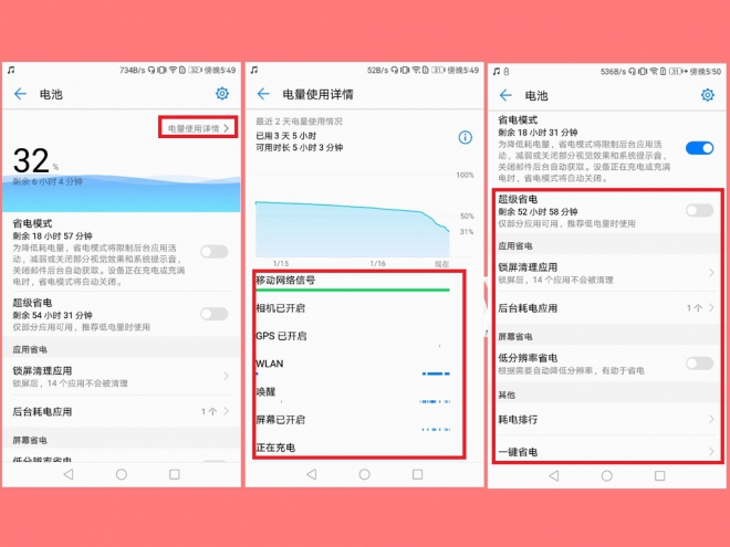 方法:手机管家>电量使用详情>超级省电、屏幕省电以及应用省电等等