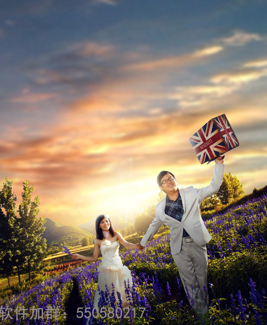 Photoshop给花海中的情侣加上唯美的霞光