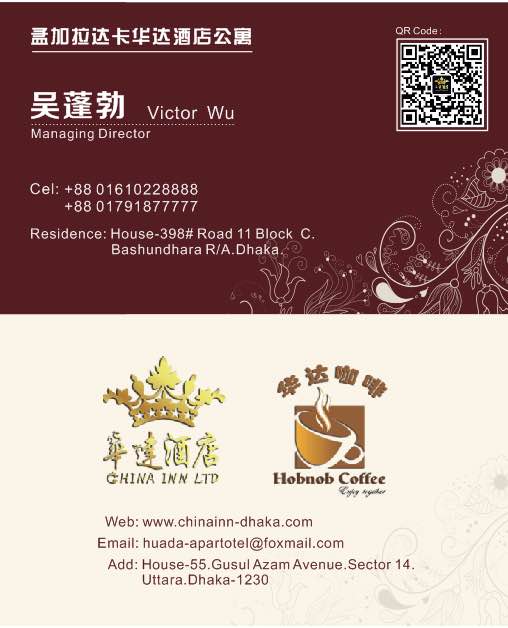 Tina: +8801685088888Julie: +8801610988888 (华达宾馆)China Inn Dhaka