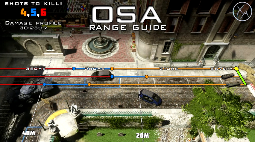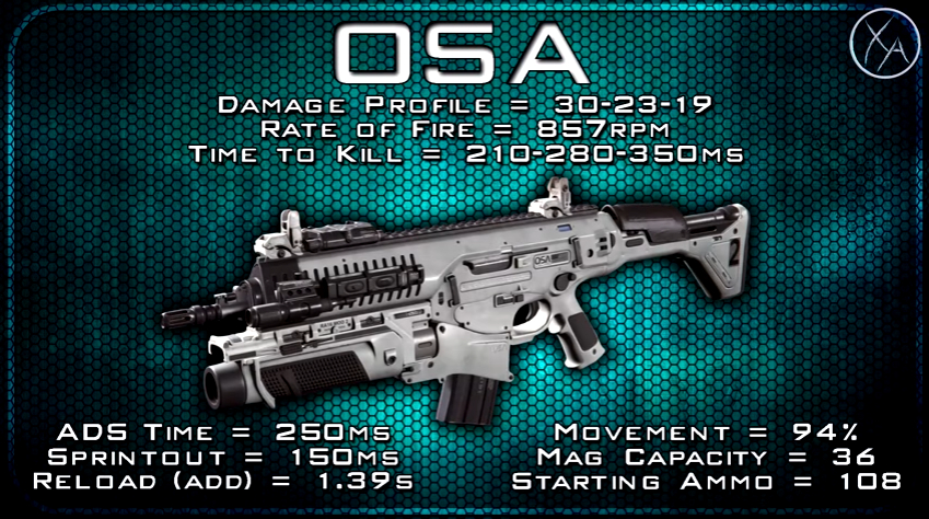 OSA,捆绑榴弹发射器的AR伤害30-23-19,对应4-5-6发带走敌人,射速857RPM,毙敌时间210-280-350ms。